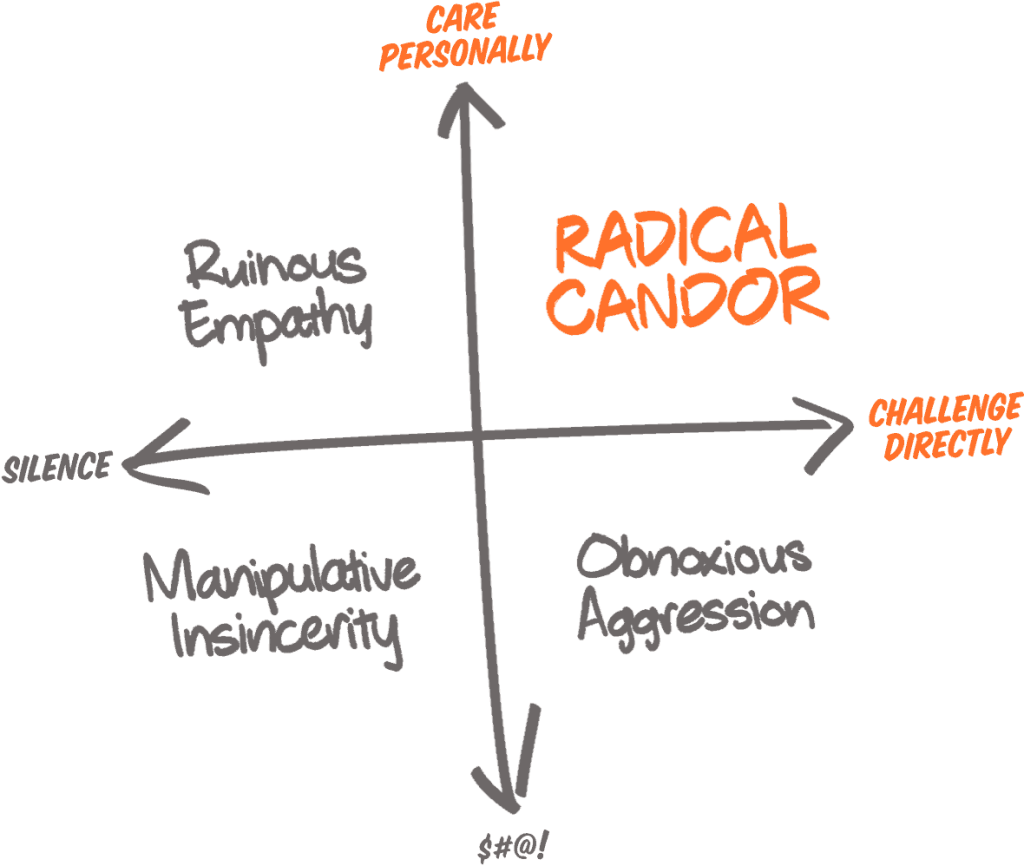החלק הכי מעניין בדיון הזה הוא בין אמפתיה הרסנית (Ruinous Empathy) לבין כנות רדיקלית (Radical Candor). כשאנחנו באמפתיה הרסנית, כל כך אכפת לנו מאנשים שאנחנו לא רוצים לפגוע בהם, ולכן לא נאמר להם דברים שיעציבו אותם. בעוד שזה מגיע ממקום טוב, התוצאה של זה גרועה מאוד. אנשים לא יודעים שיש בעיה בעבודה שלהם, ולכן לא יודעים שהם צריכים להשתפר או להשתנות. מי ששומע רק שבחים על הדברים הטובים שהוא עושה ולא שומע על הדברים שהוא עושה לא טוב בעצם מקבל רק חצי מההכוונה שהוא היה יכול לקבל.
